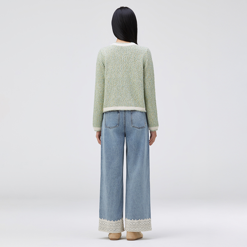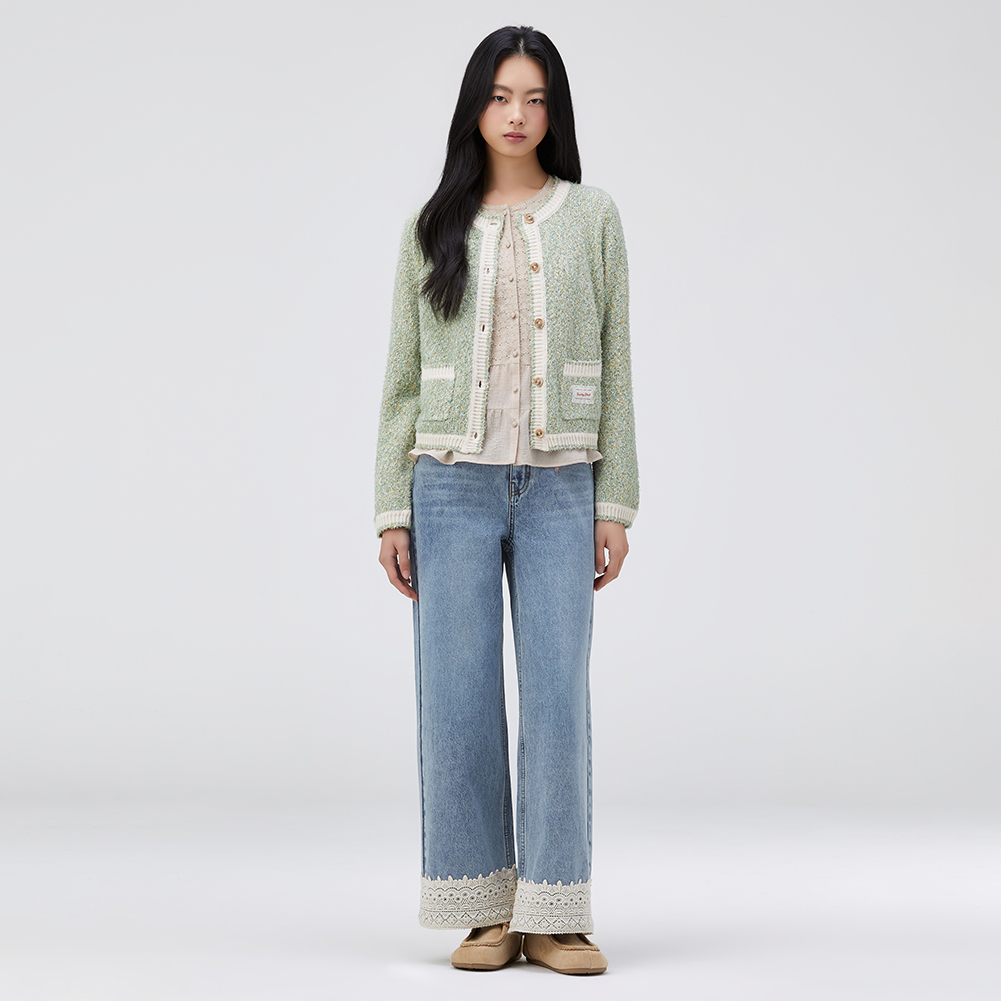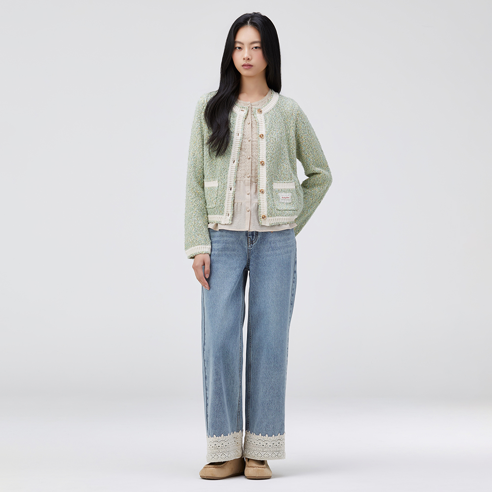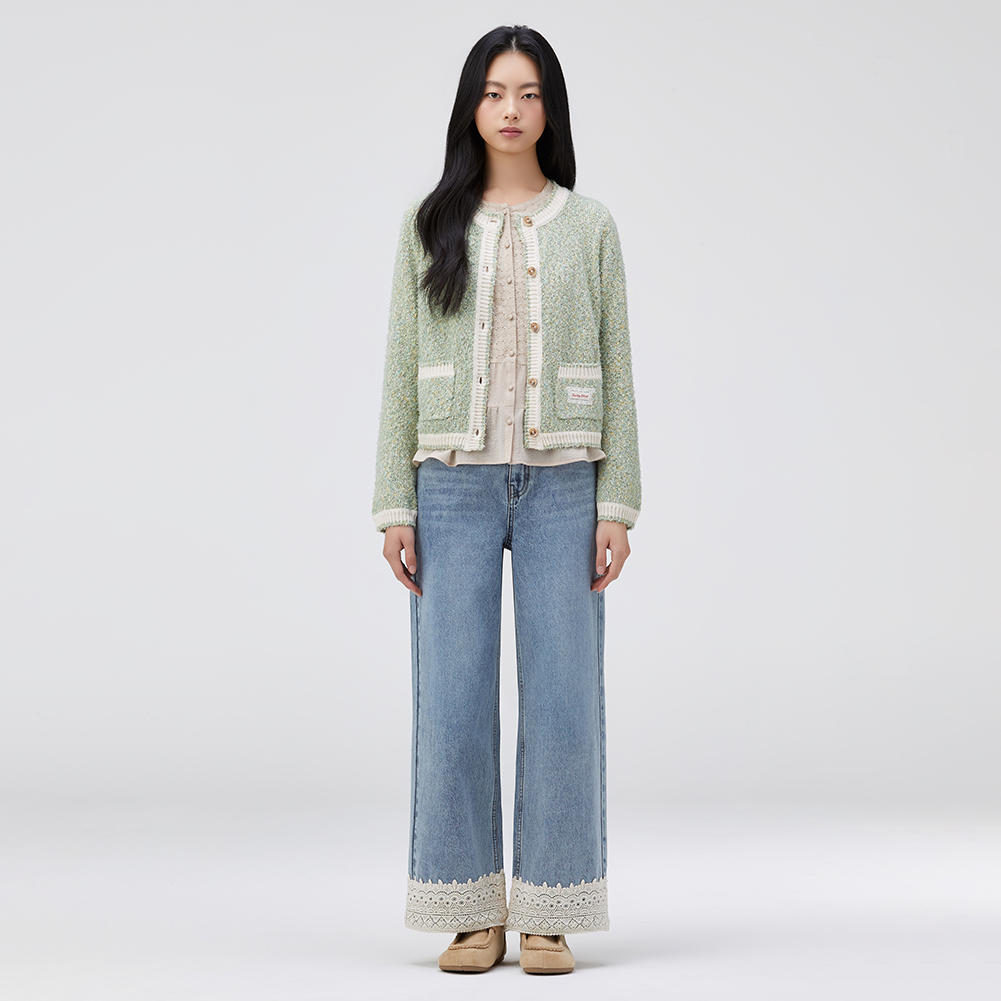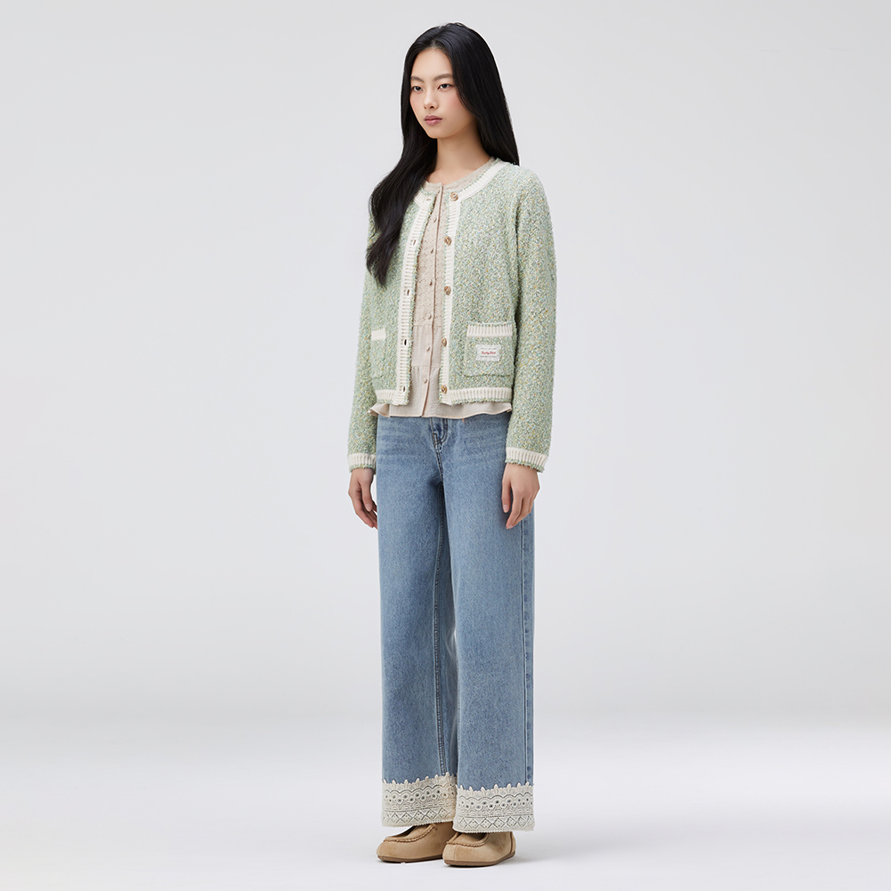 펜시얀과 날개사의 유니크한 텍스처가 돋보이는 자켓 스타일의 니트 가디건.네크라인,소매단,주머니단,몸판 하단에 배색라인으로 포인트를 주었으며 착용감이 편한 아이템.