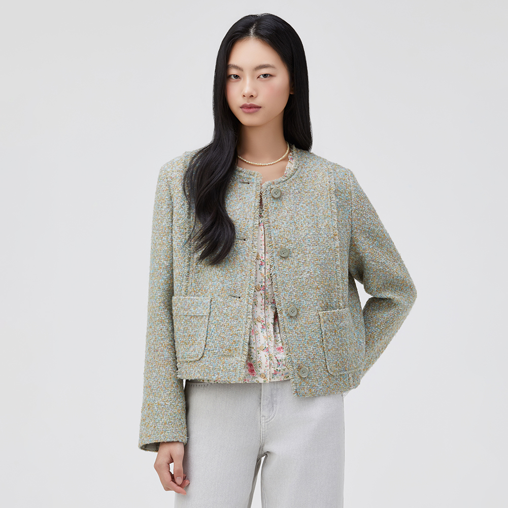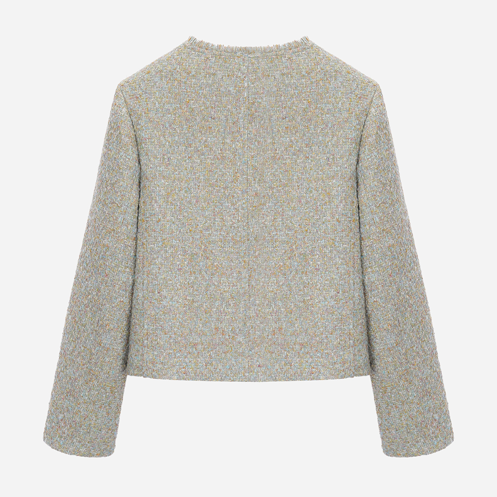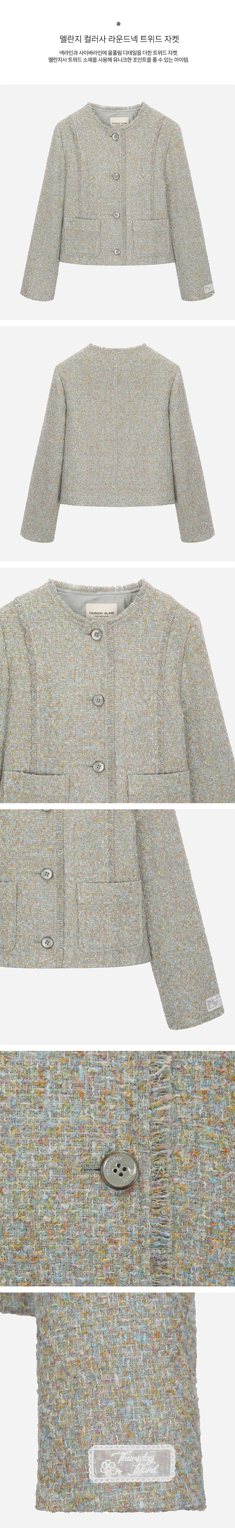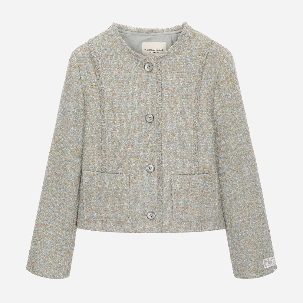넥라인과 사이바라인에 올풀림 디테일을 더한 트위드 자켓.멜란지사 트위드 소재를 사용해 유니크한 포인트를 줄 수있는 아이템.