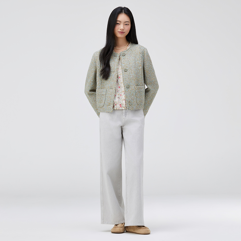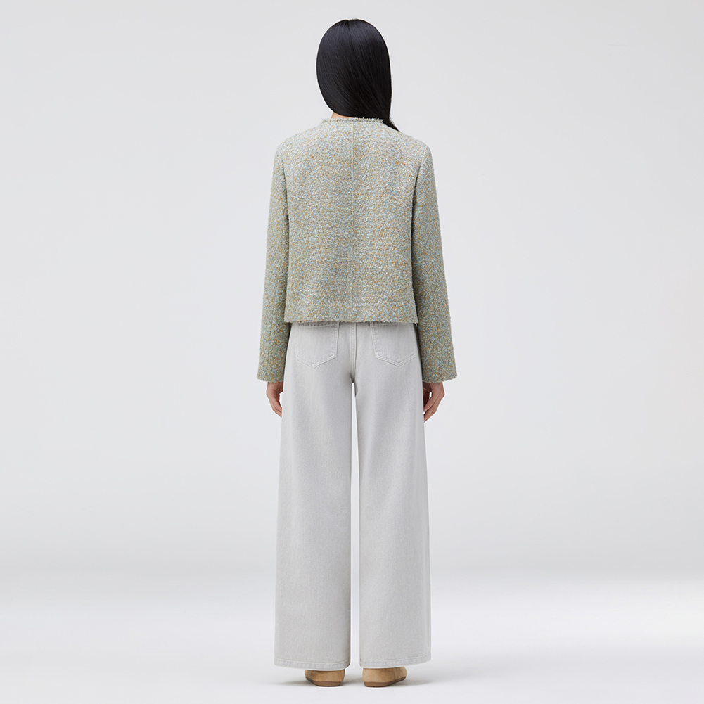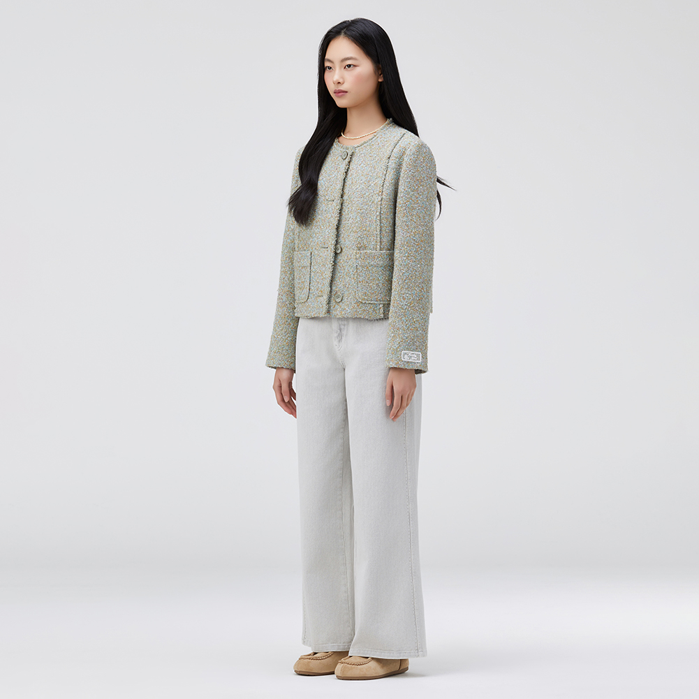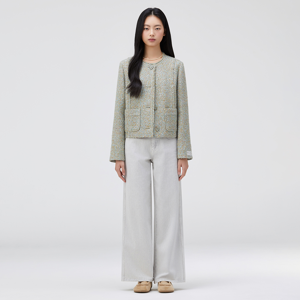 넥라인과 사이바라인에 올풀림 디테일을 더한 트위드 자켓.멜란지사 트위드 소재를 사용해 유니크한 포인트를 줄 수있는 아이템.