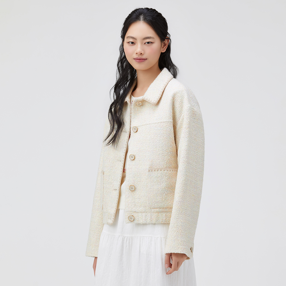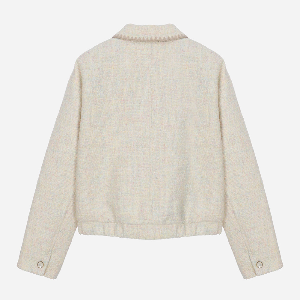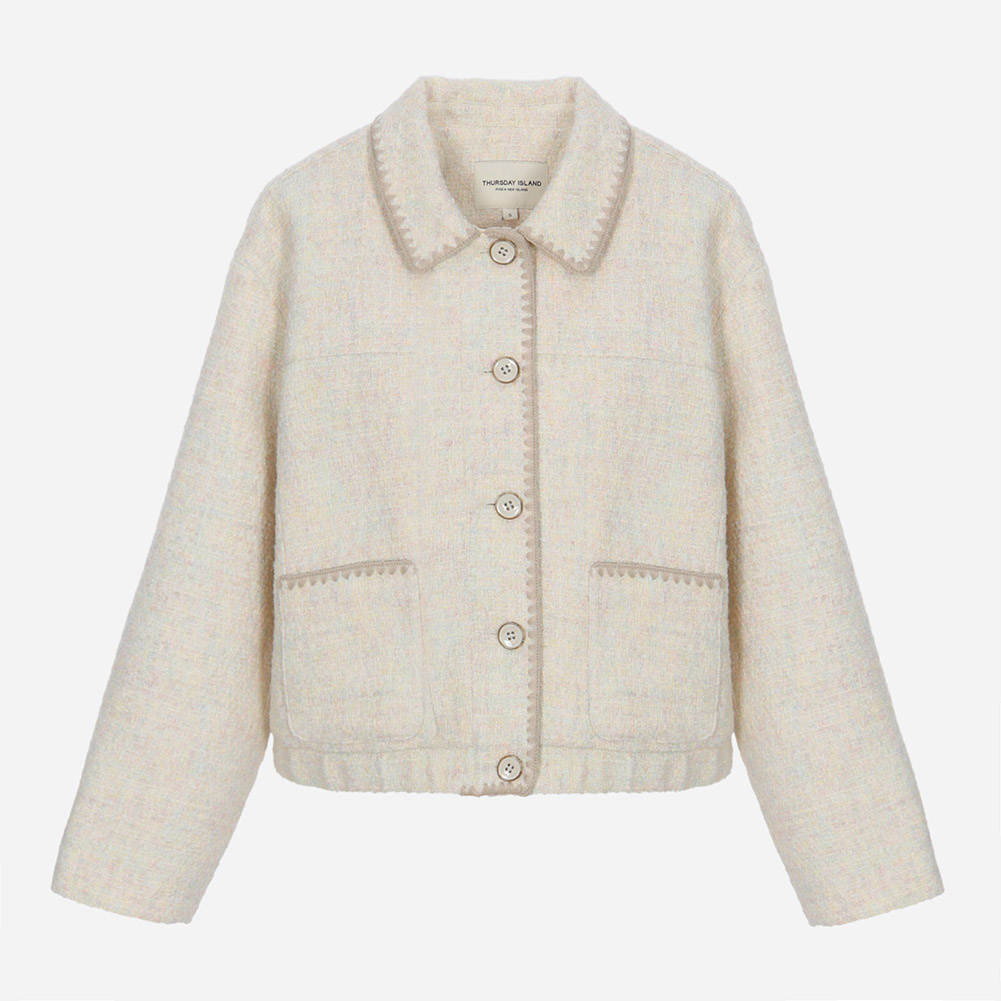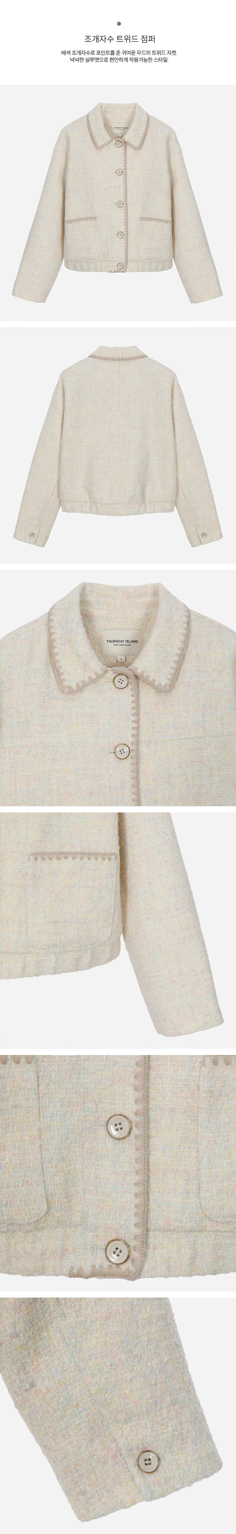 배색 조개자수로 포인트를 준 귀여운 무드의 트위드 자켓.넉넉한 실루엣으로 편안하게 착용가능한 스타일.