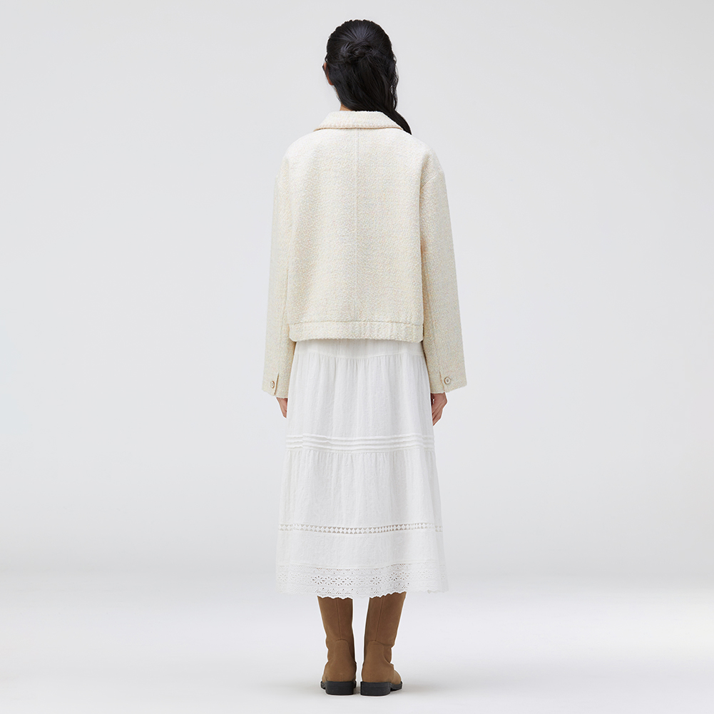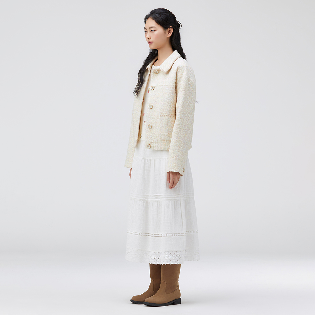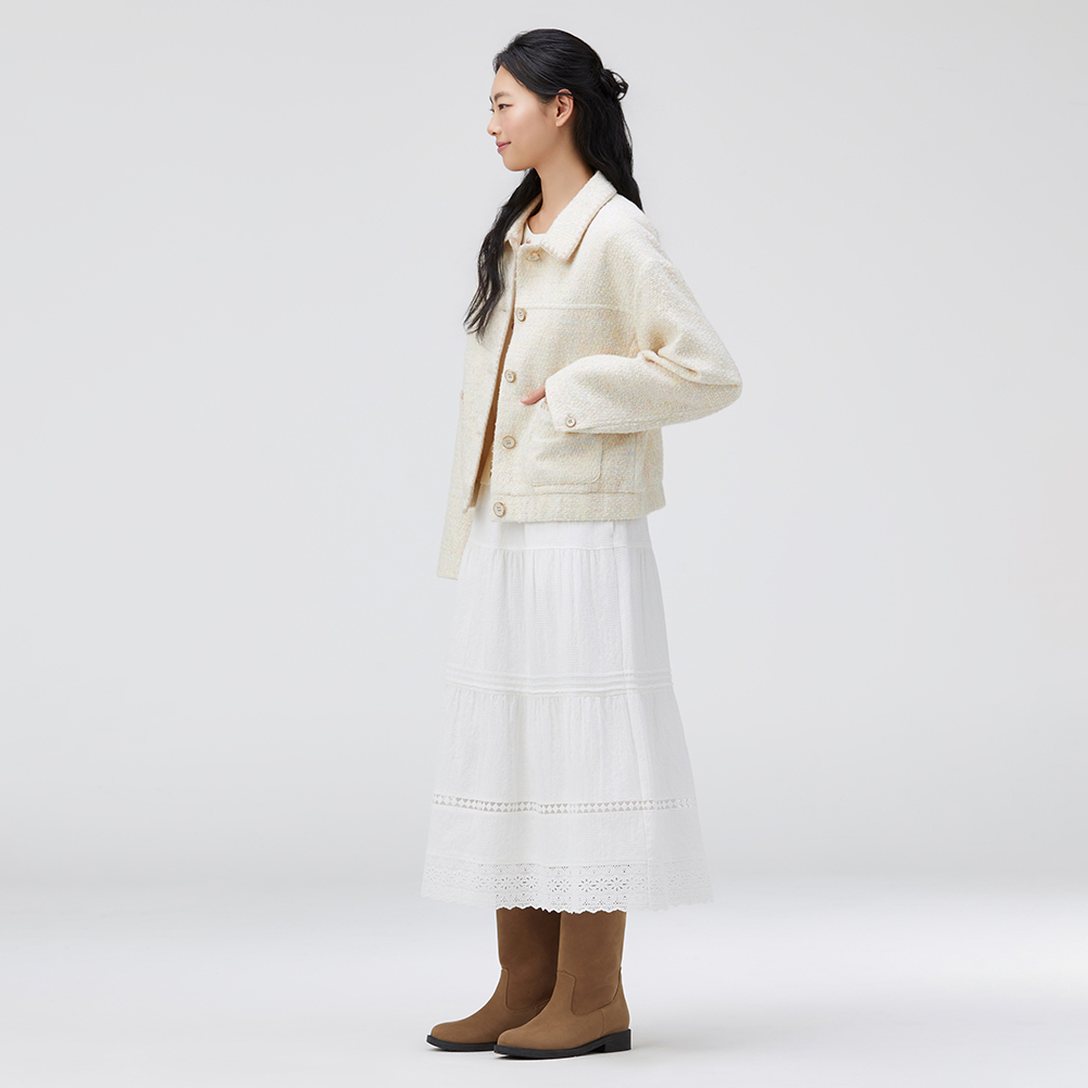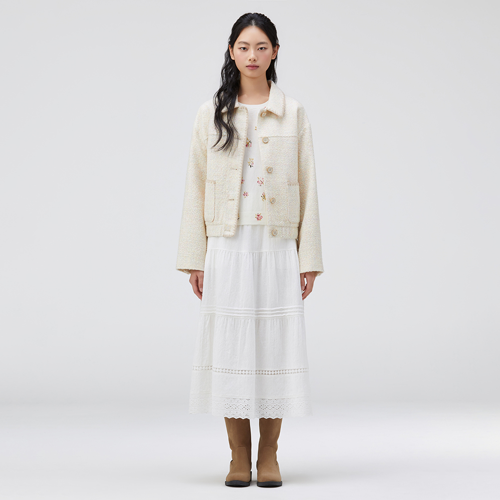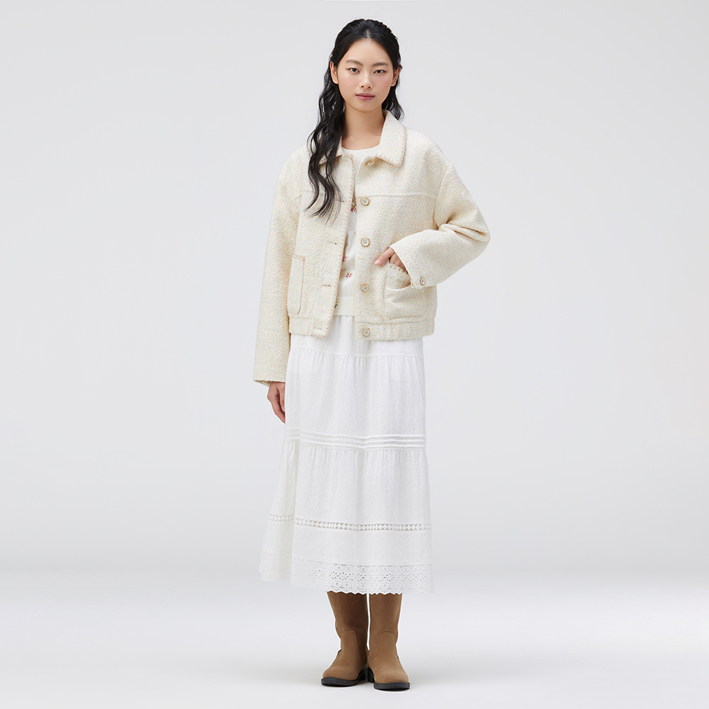 배색 조개자수로 포인트를 준 귀여운 무드의 트위드 자켓.넉넉한 실루엣으로 편안하게 착용가능한 스타일.