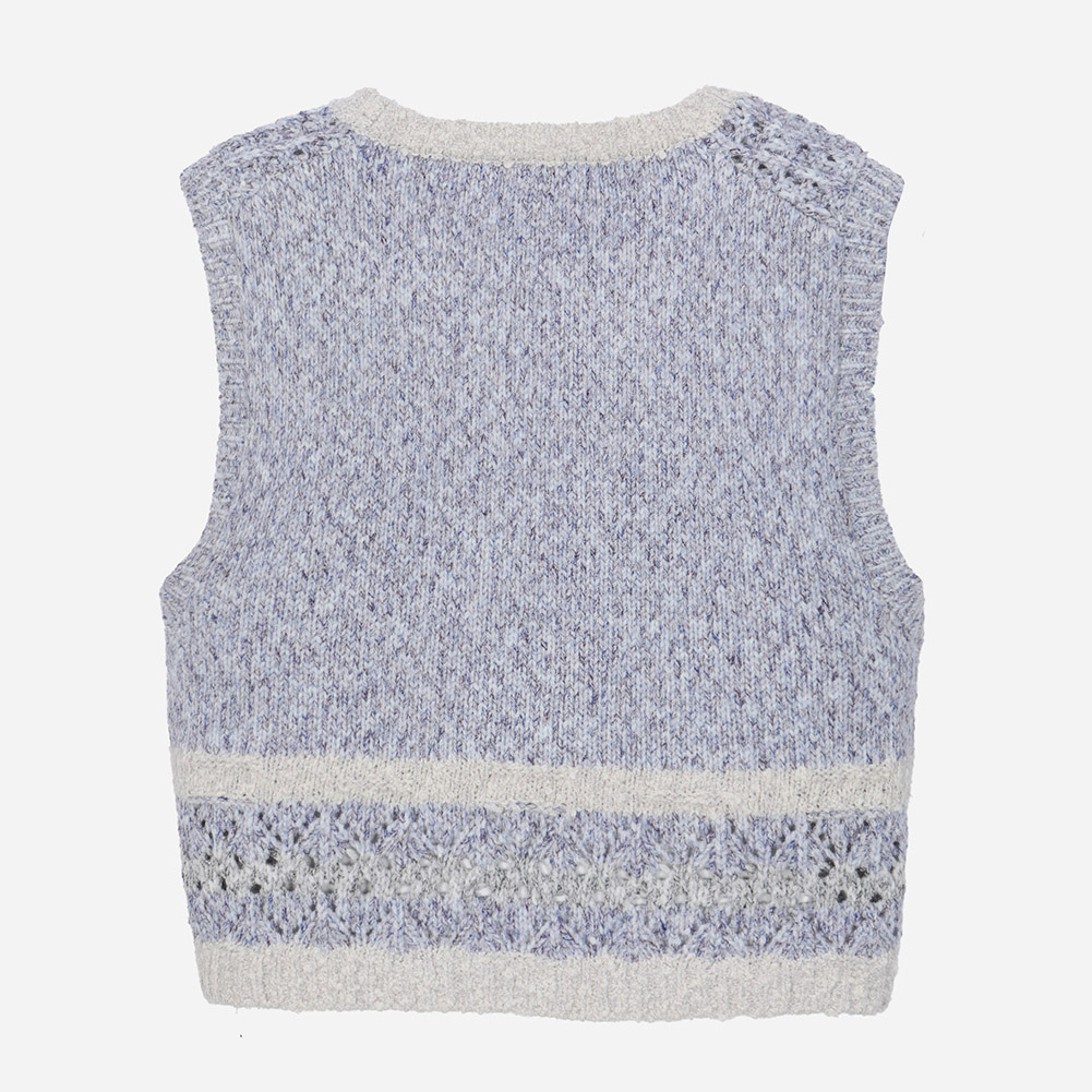 유니크한 컬러감의 멜란지 원사를 사용한 니트 베스트.부속과 몸판 중간에 있는 배색컬러, 스카시 조직이 완성도있게 어우려져 데일리하게 착용가능한 아이템.