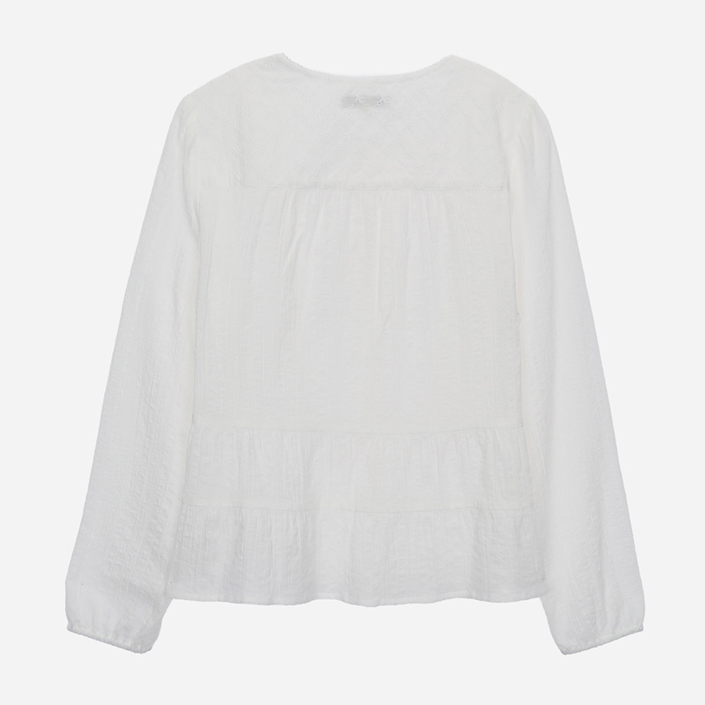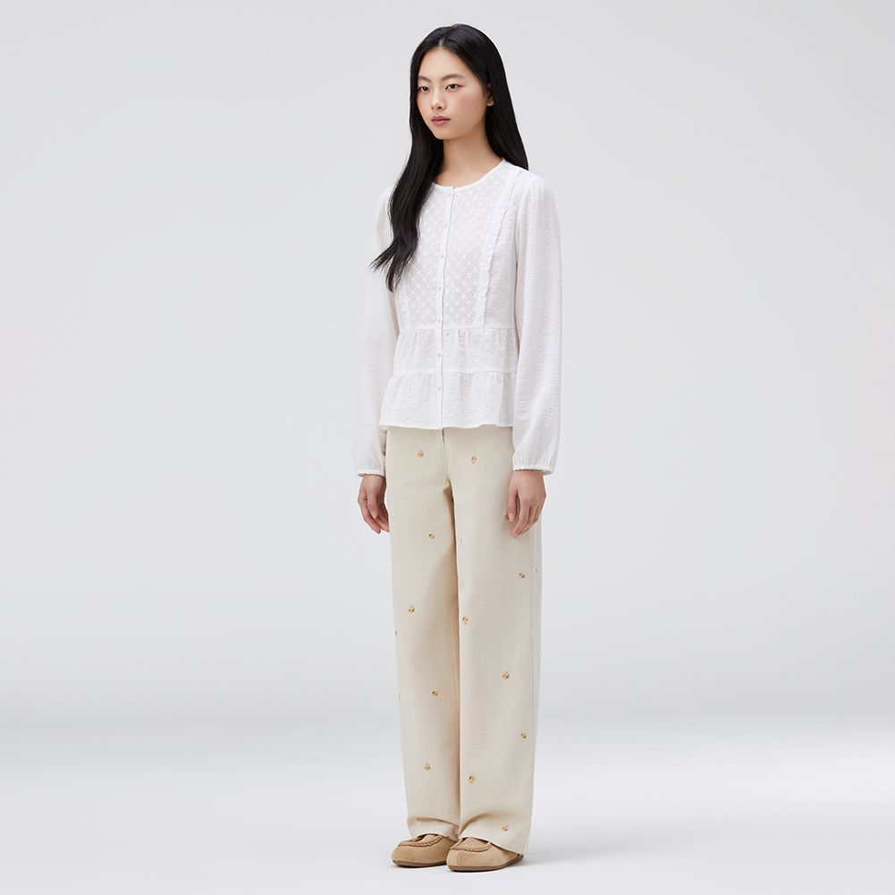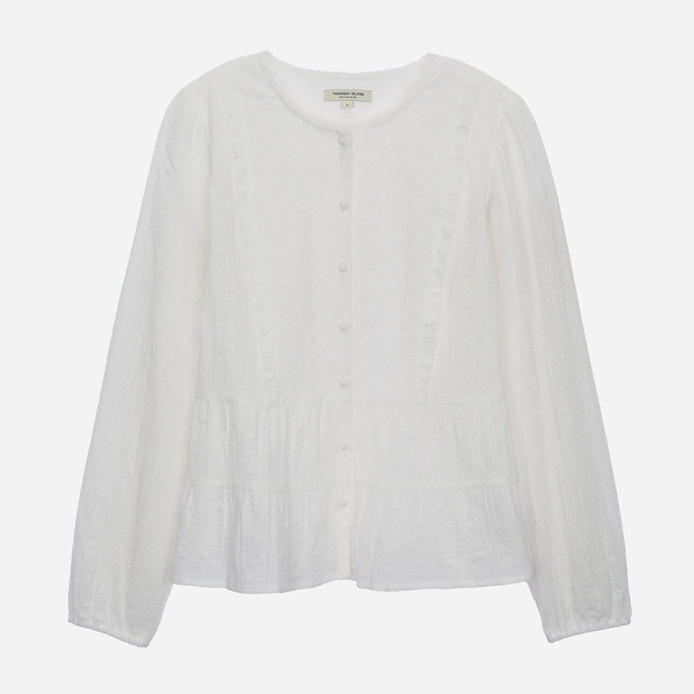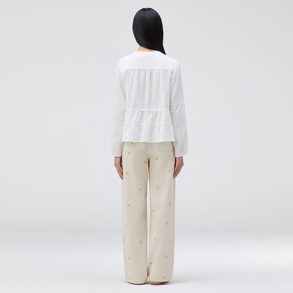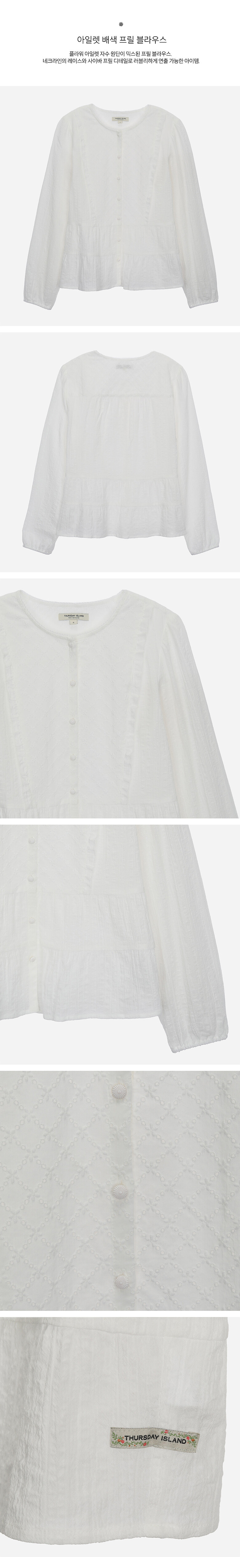 네크라인의 레이스와 사이바 프릴 디테일로 러블리하게 연출 가능한 아이템.