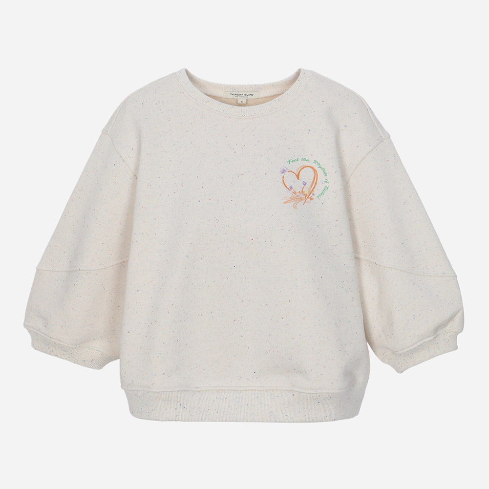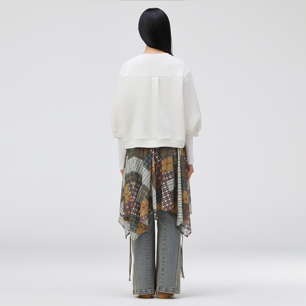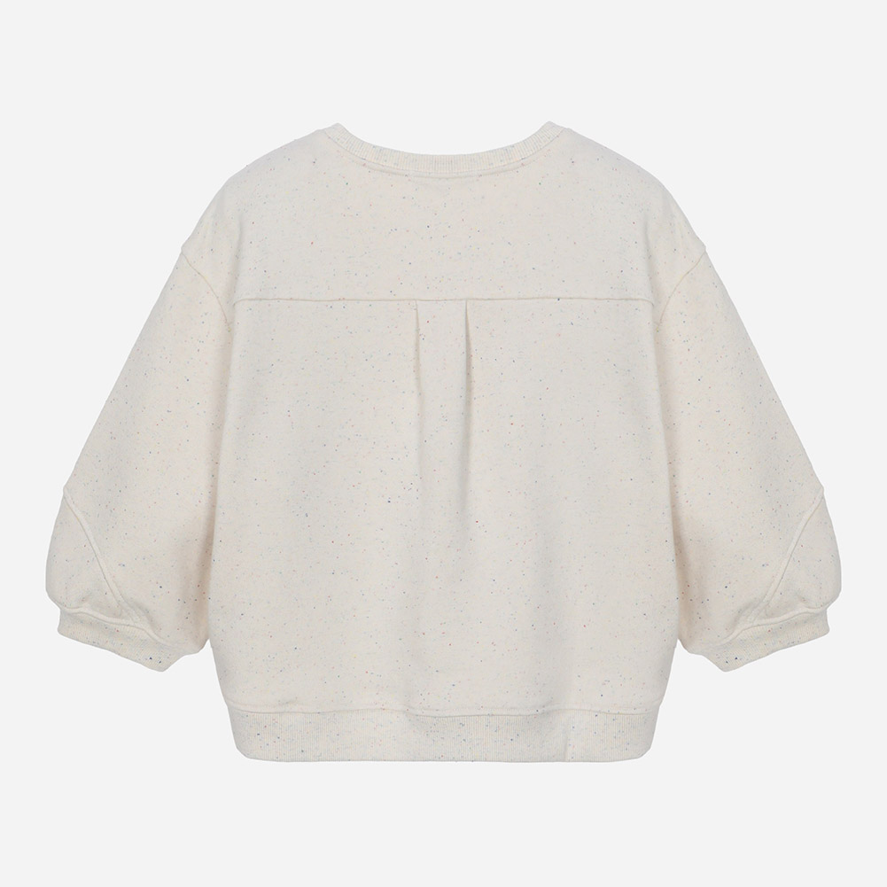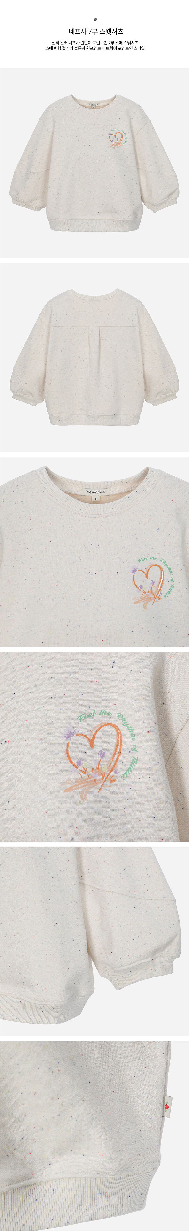 멀티 컬러 네프사 원단이 포인트인 7부 소매 스웻셔츠.소매 변형 절개의 볼륨과 원포인트 아트웍이 포인트인 스타일.