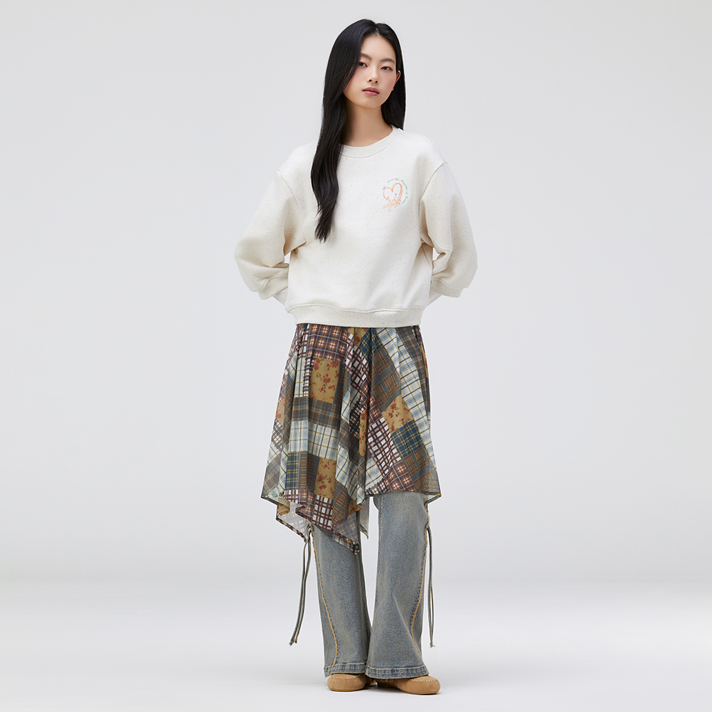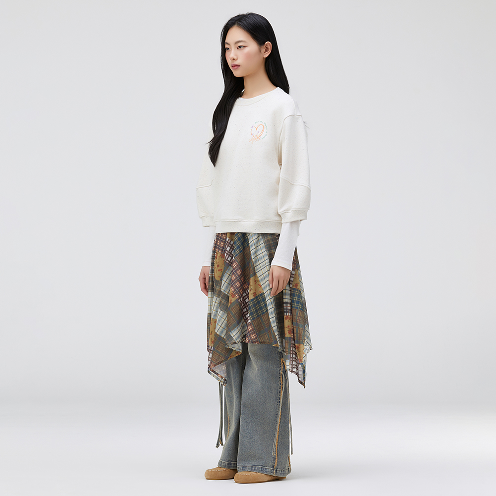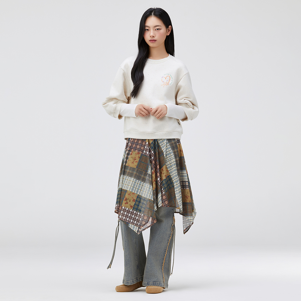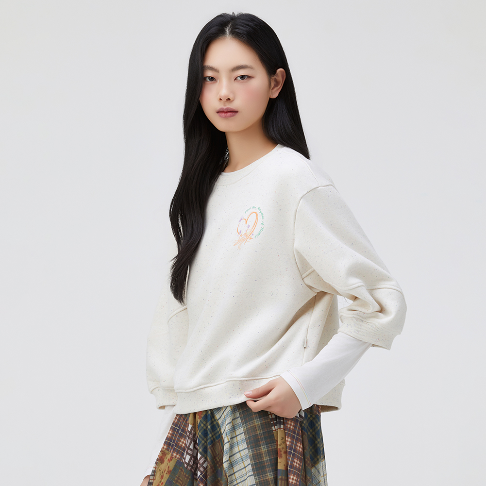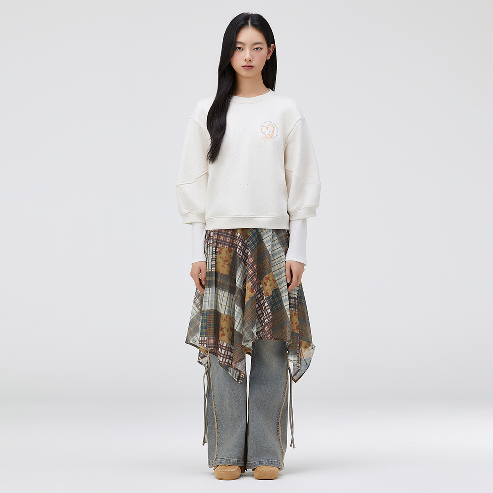 멀티 컬러 네프사 원단이 포인트인 7부 소매 스웻셔츠.소매 변형 절개의 볼륨과 원포인트 아트웍이 포인트인 스타일.