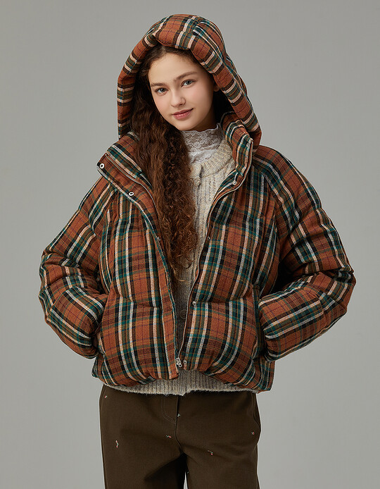 Thursday Island[KiiiKiii 착용] 체크 후드 덕 다운 점퍼